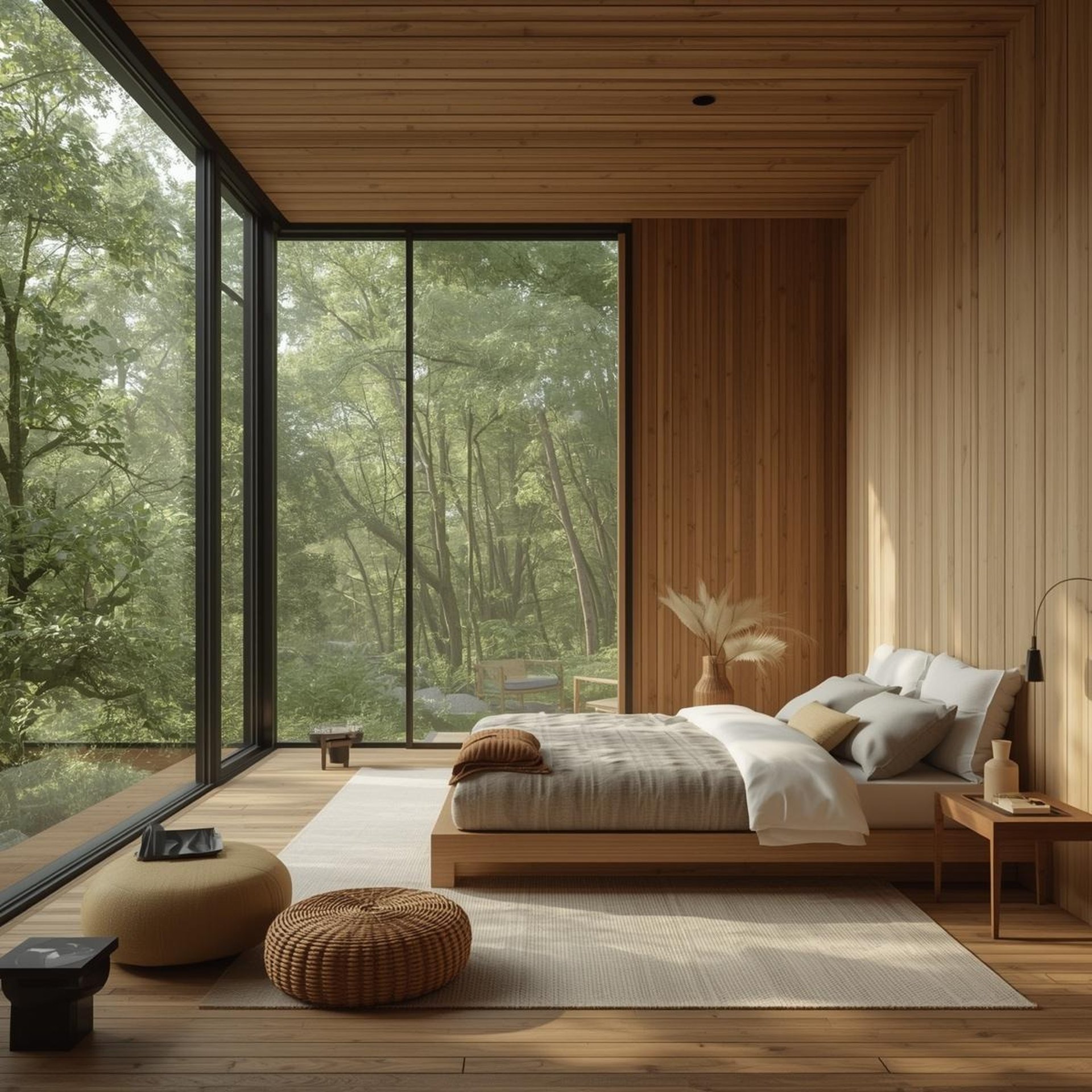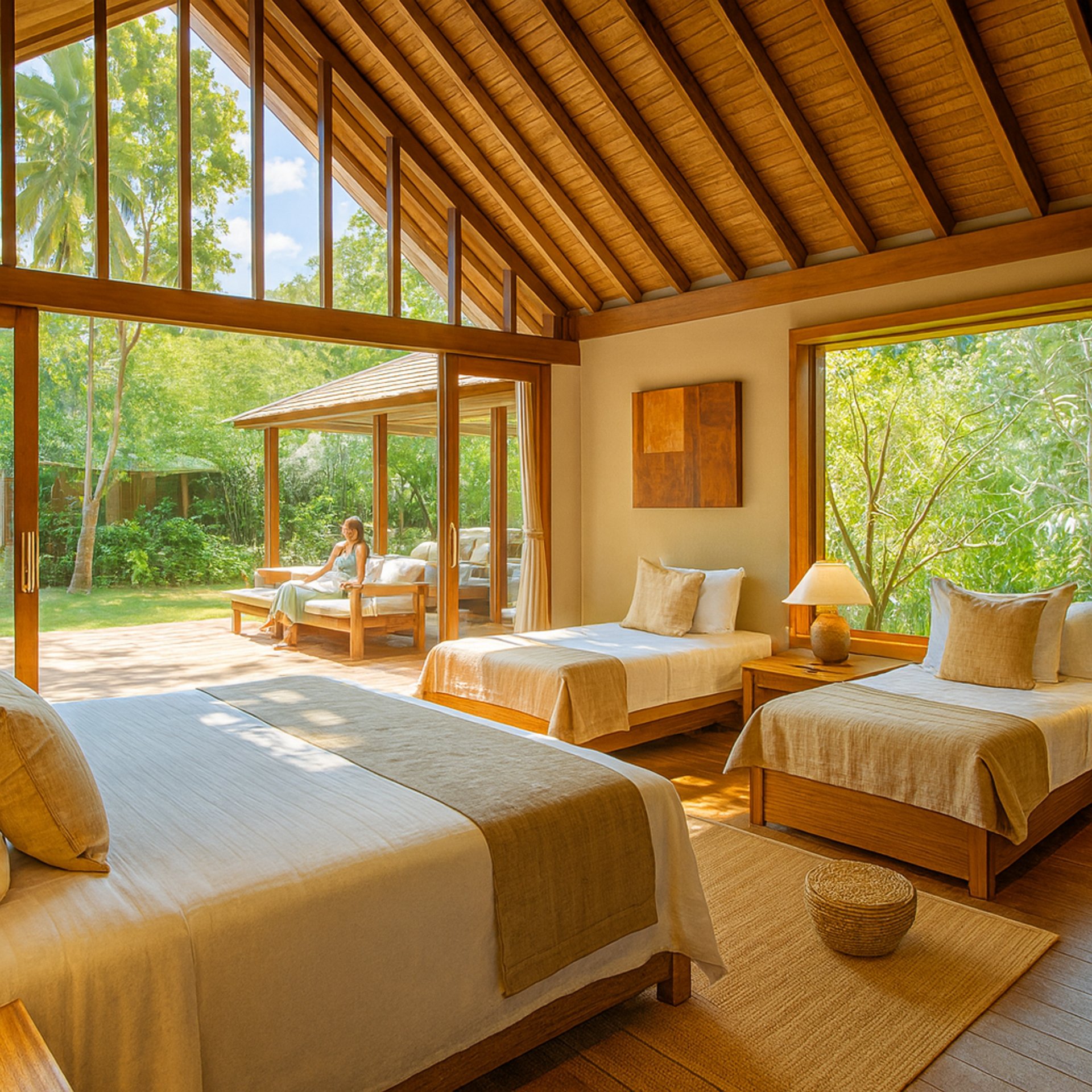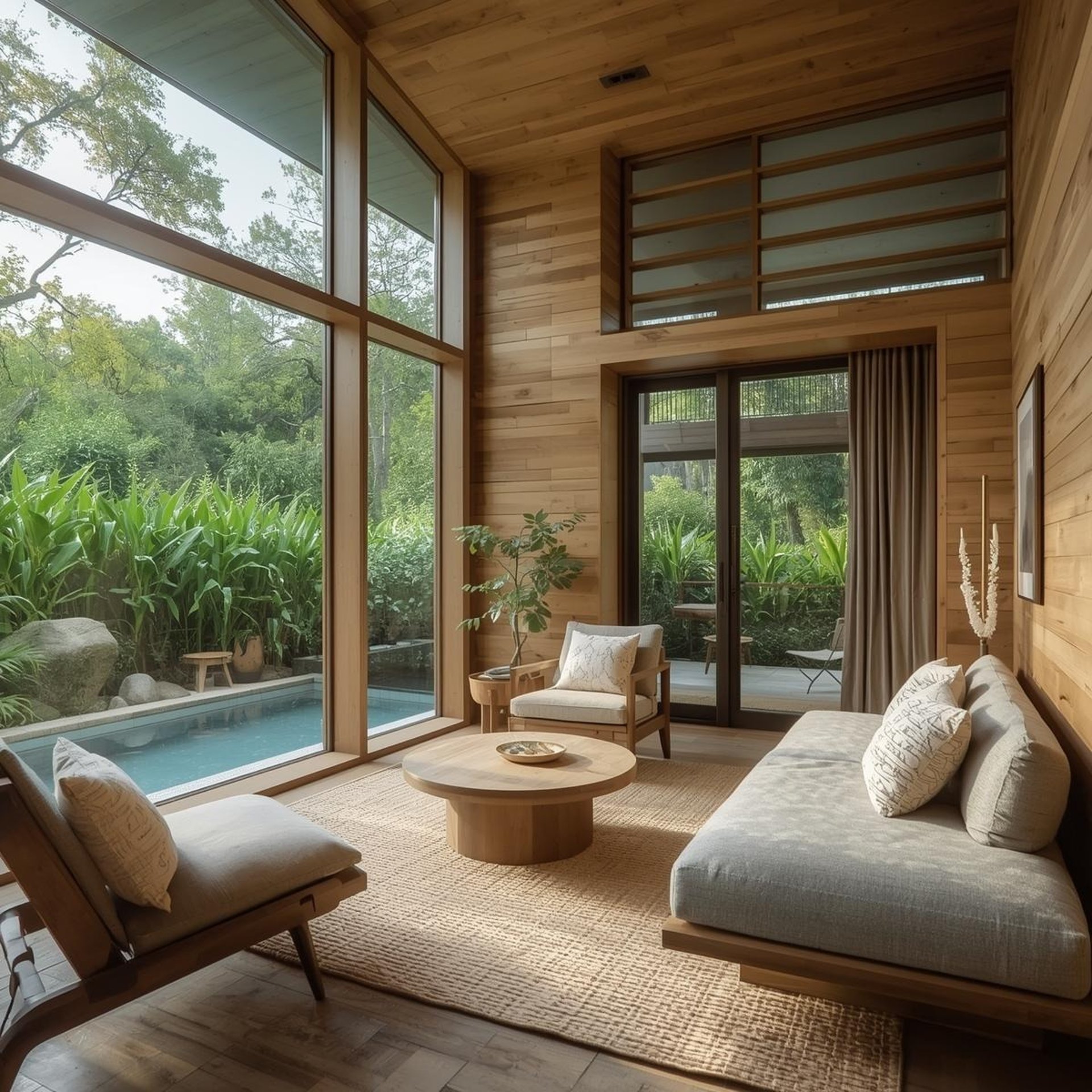 Spacious eco-luxury retreat with warm wooden interiors and earthy tones