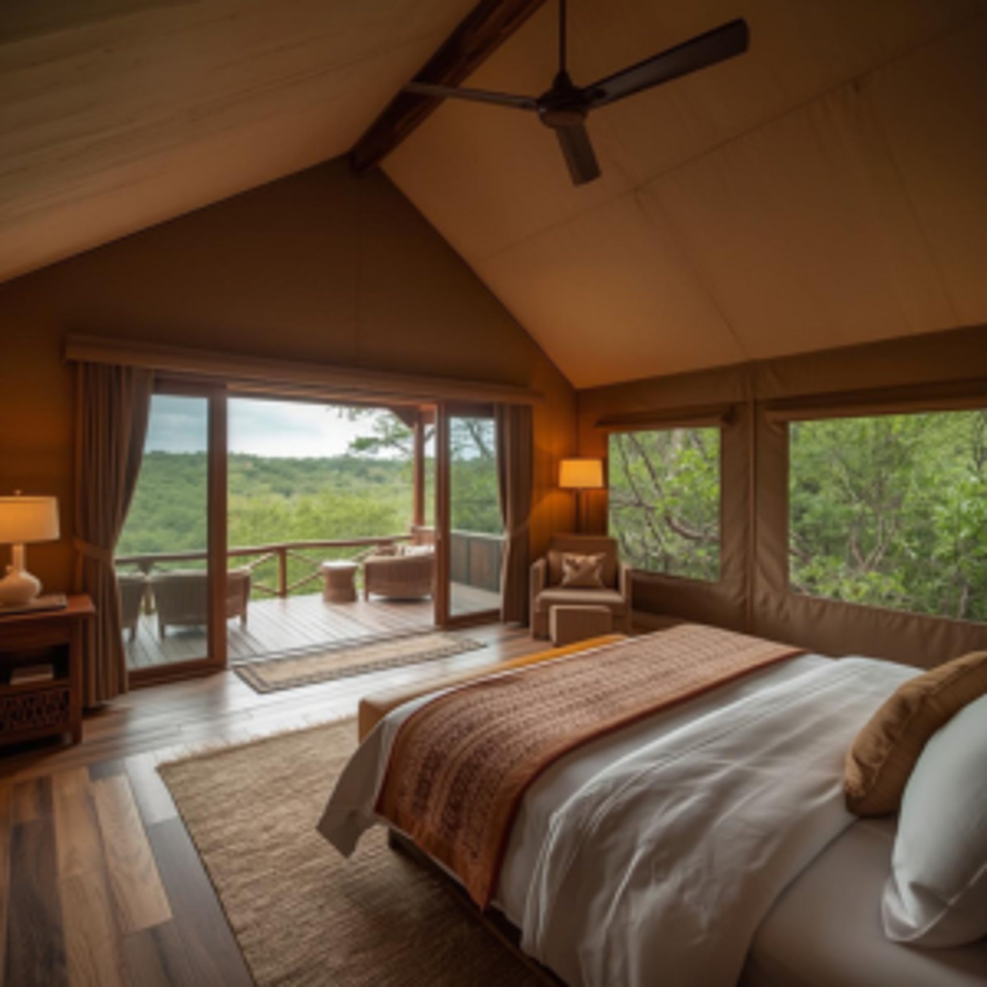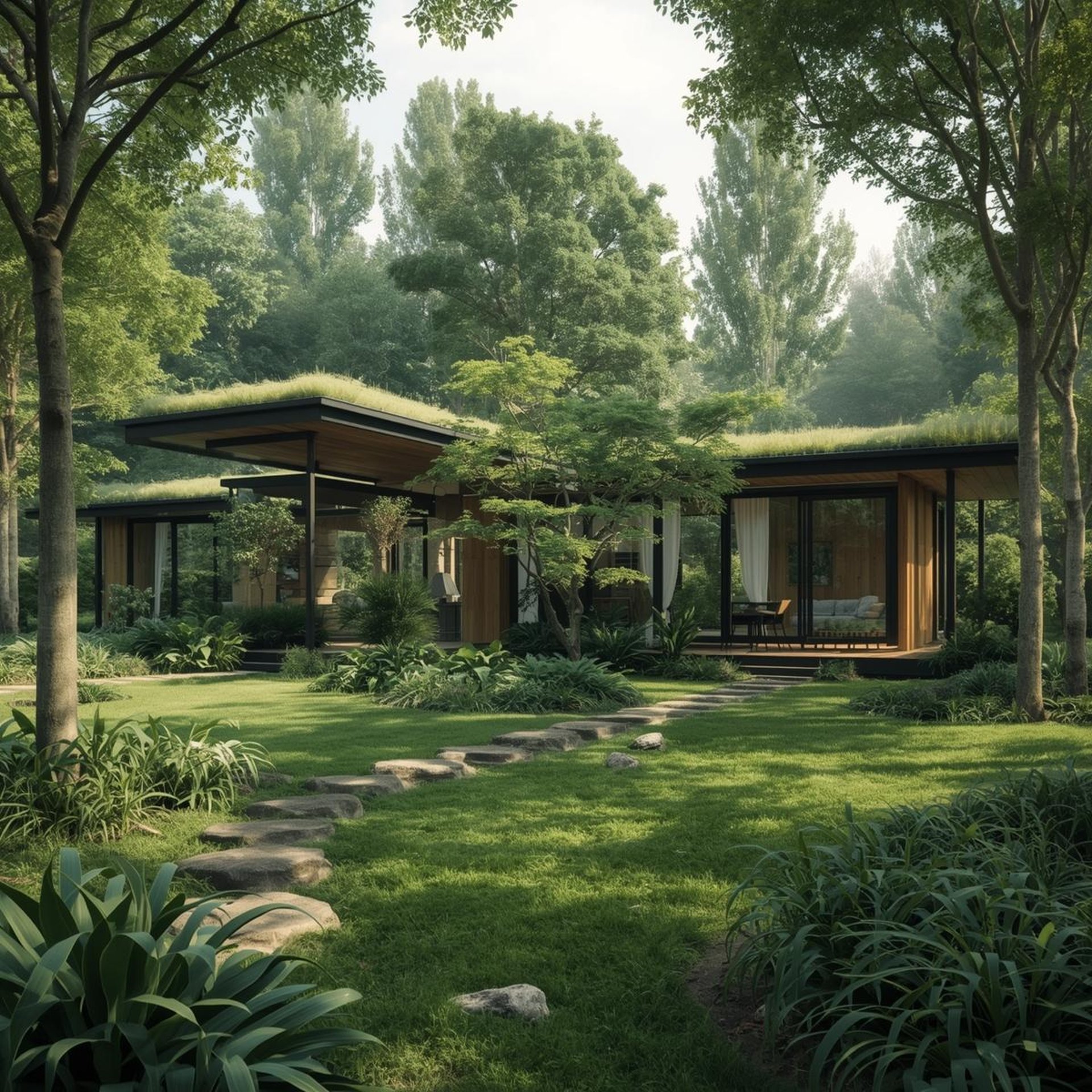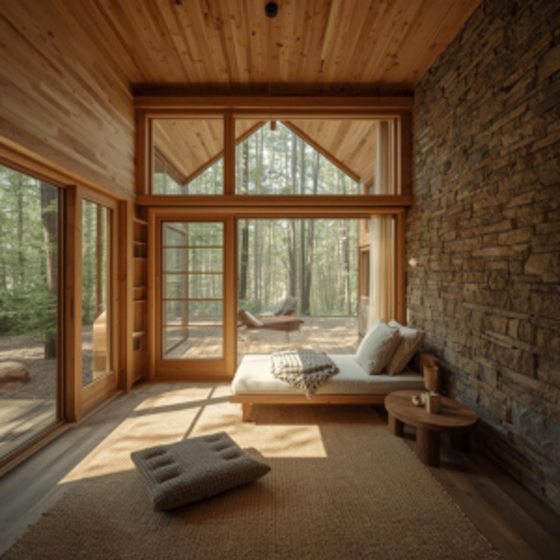 Spacious eco-luxury retreat with warm wooden interiors and earthy tones